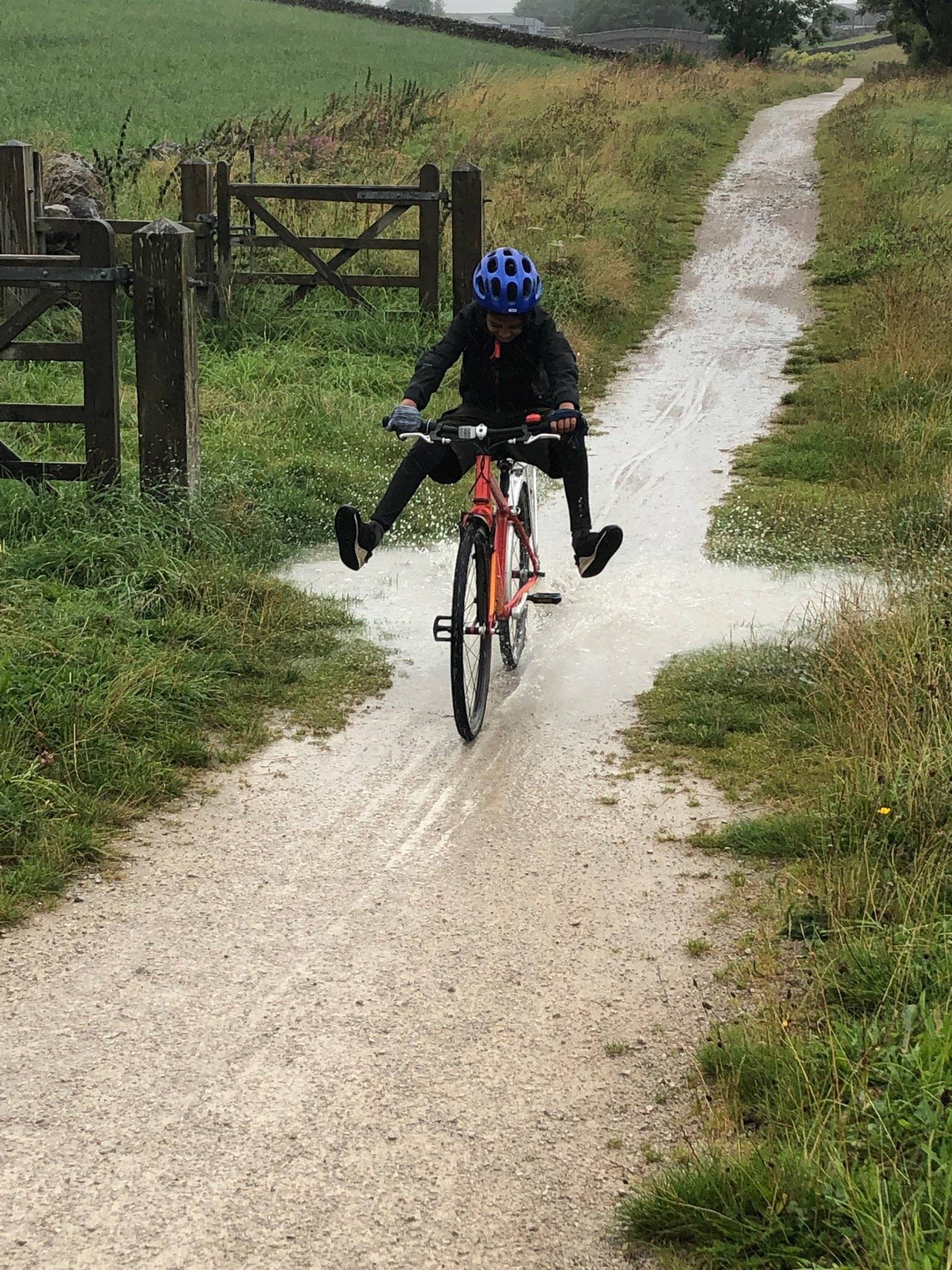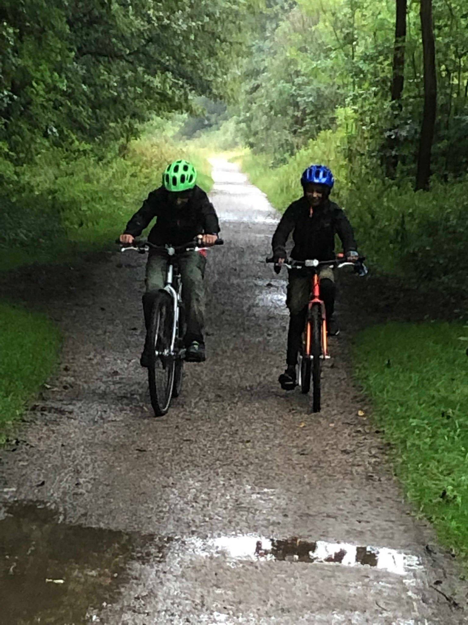 The surface is gravel throughout, but is easy to ride on, even when wet. After or during rain, puddles will form in places, and it can get a bit muddy.